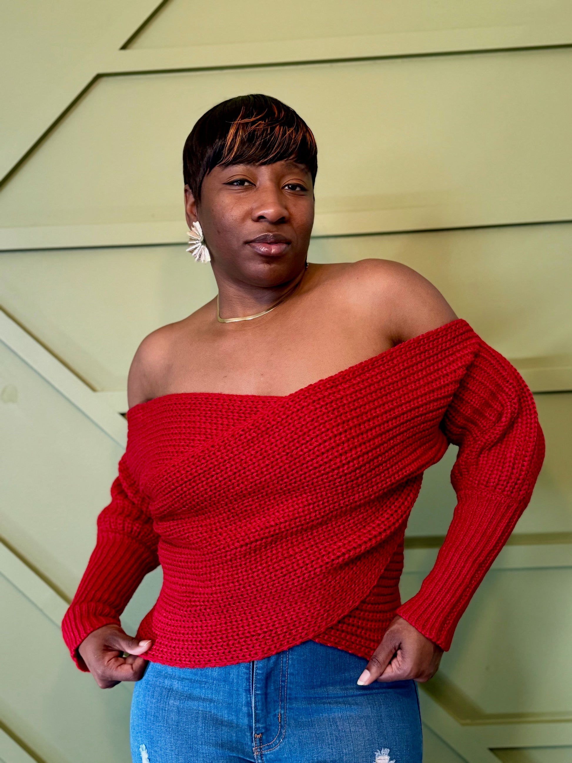 Rosie Wrap Sweater-Red is a great item to add to your wardrobe for this fall and winter. This sweater is not only sexy but comfy. The material is super thick to keep you warm and the sleeves are long. Rosie Wrap Sweater-Red can be worn two different ways. You have the option to twist the knot in the front or back showing off some skin. This sweater is off the shoulders.
